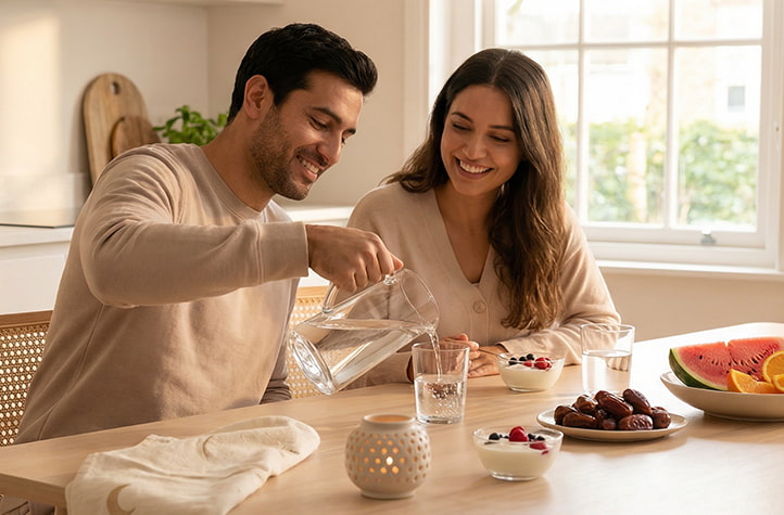 - • Smart timing to rehydrate is soon after Iftar, before bed, and again at Suhoor.